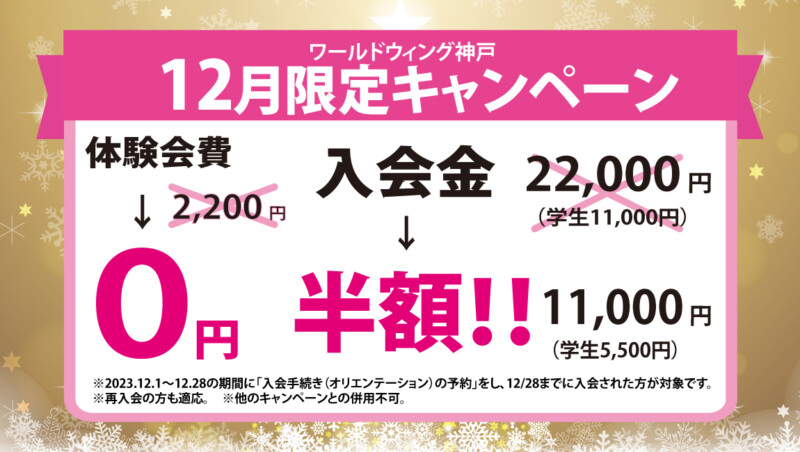ワールドウィング神戸2023年12月限定キャンペーンのご案内です。