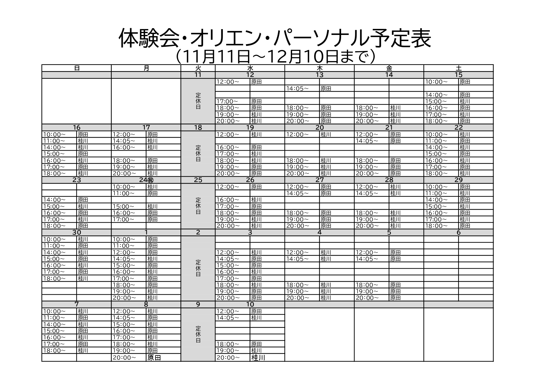 予定表にない日程はお問い合わせください。