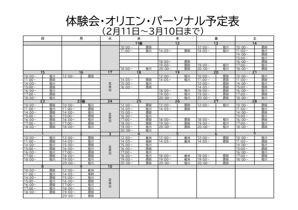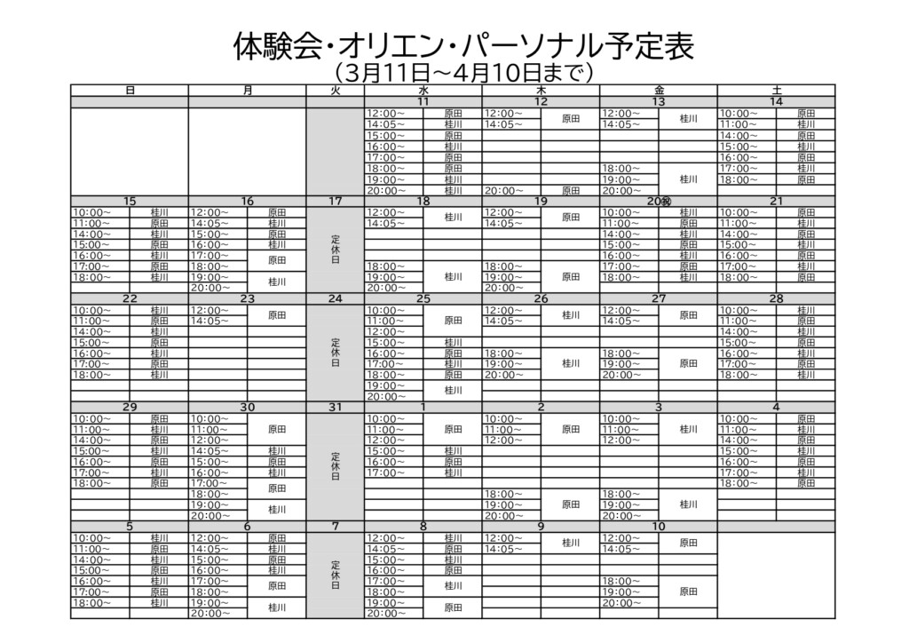体験会・オリエンテーション予定表